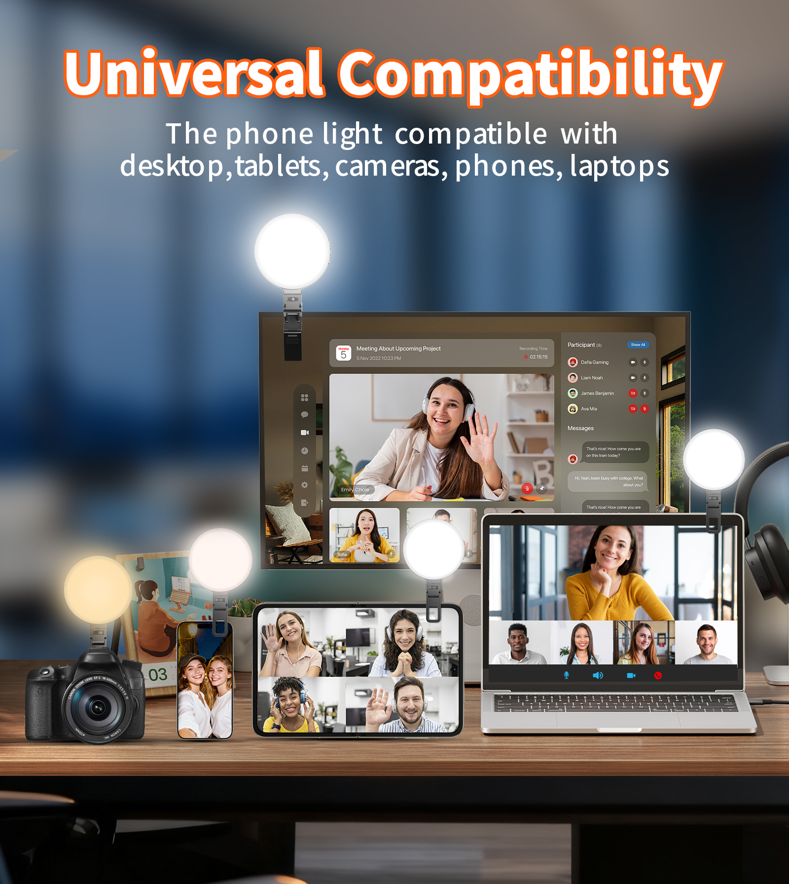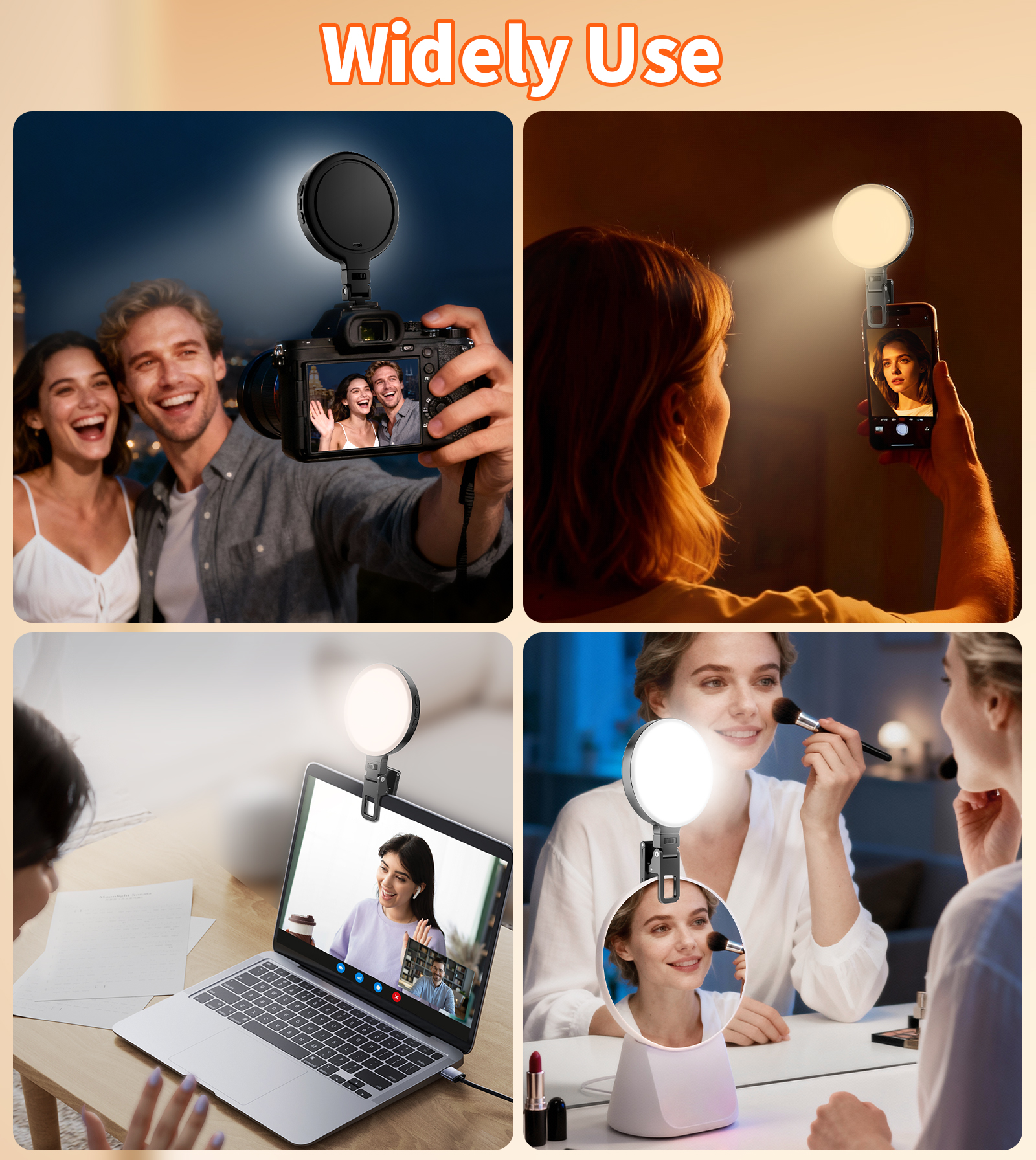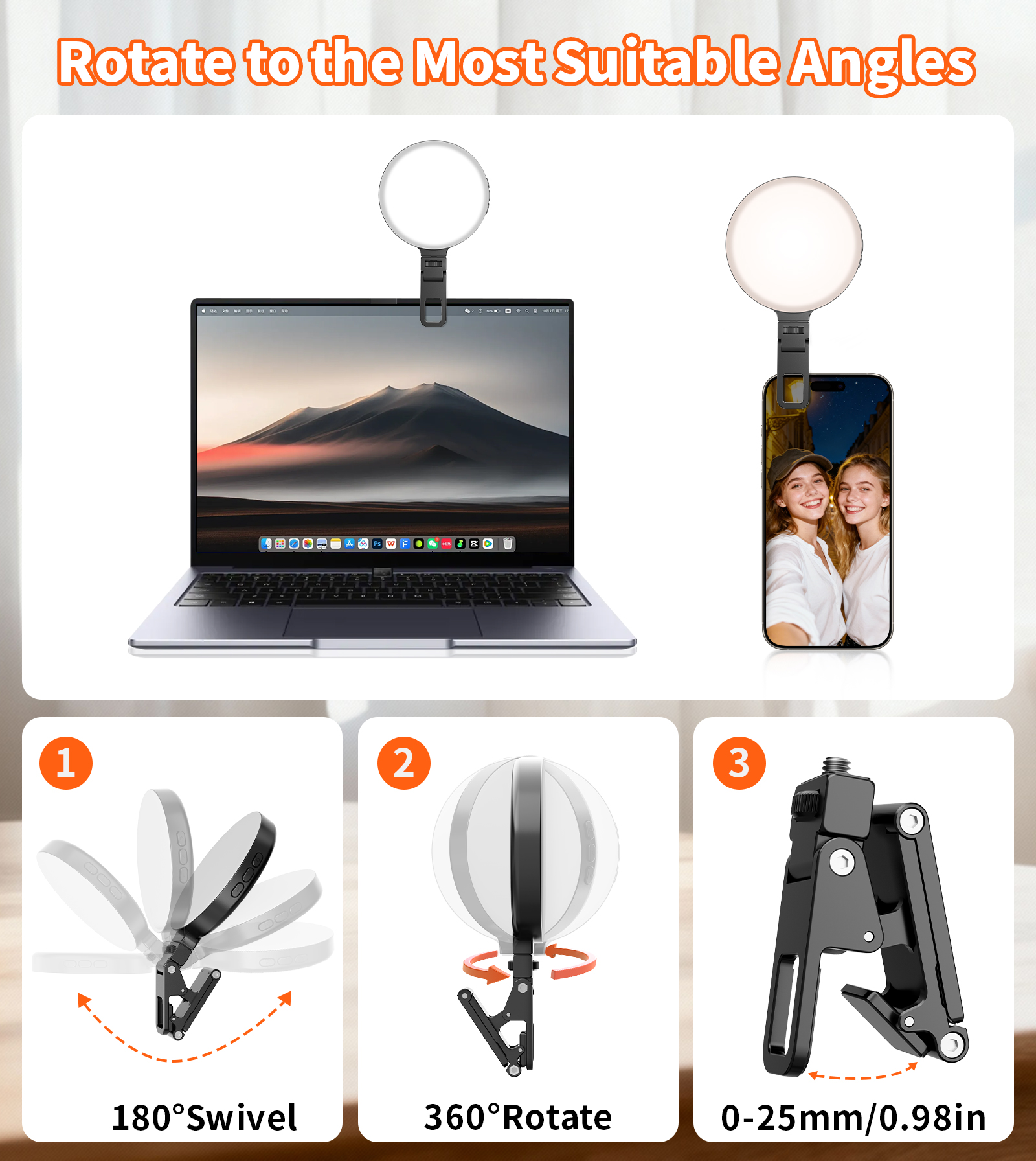 Easy to Use: Clip light allow tool-free attachment to devices, screw the fill light base screw hole into the 1/4" thread interface of the clip. Once selfie light for iphone is installed, simply clamp it directly onto phones, tablets, or laptops, and can use the central angle adjustment knob to position the ring light to your desired angle, allowing you to choose the right angle of light when taking pictures without blocking the camera or screen. Recommended to read the instructions before use.