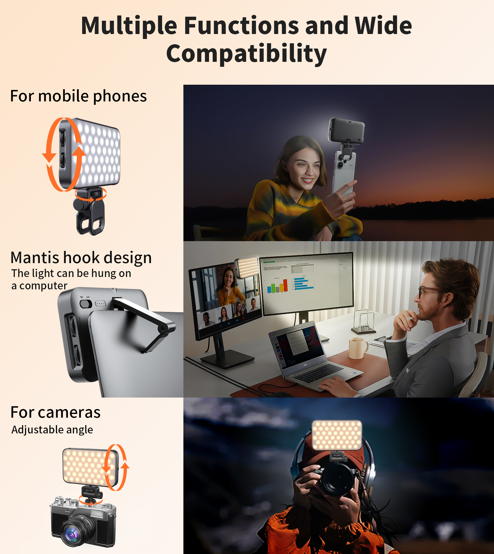 Multifunctional Use: The LED light has two 1/4" threaded holes for horizontal/vertical mounting on a clip or cold shoe port adapter, compatible with mobile phones, cameras, tripods, tablets, laptops, and other devices. The clip can be adjusted to rotate at an angle for ease of use.