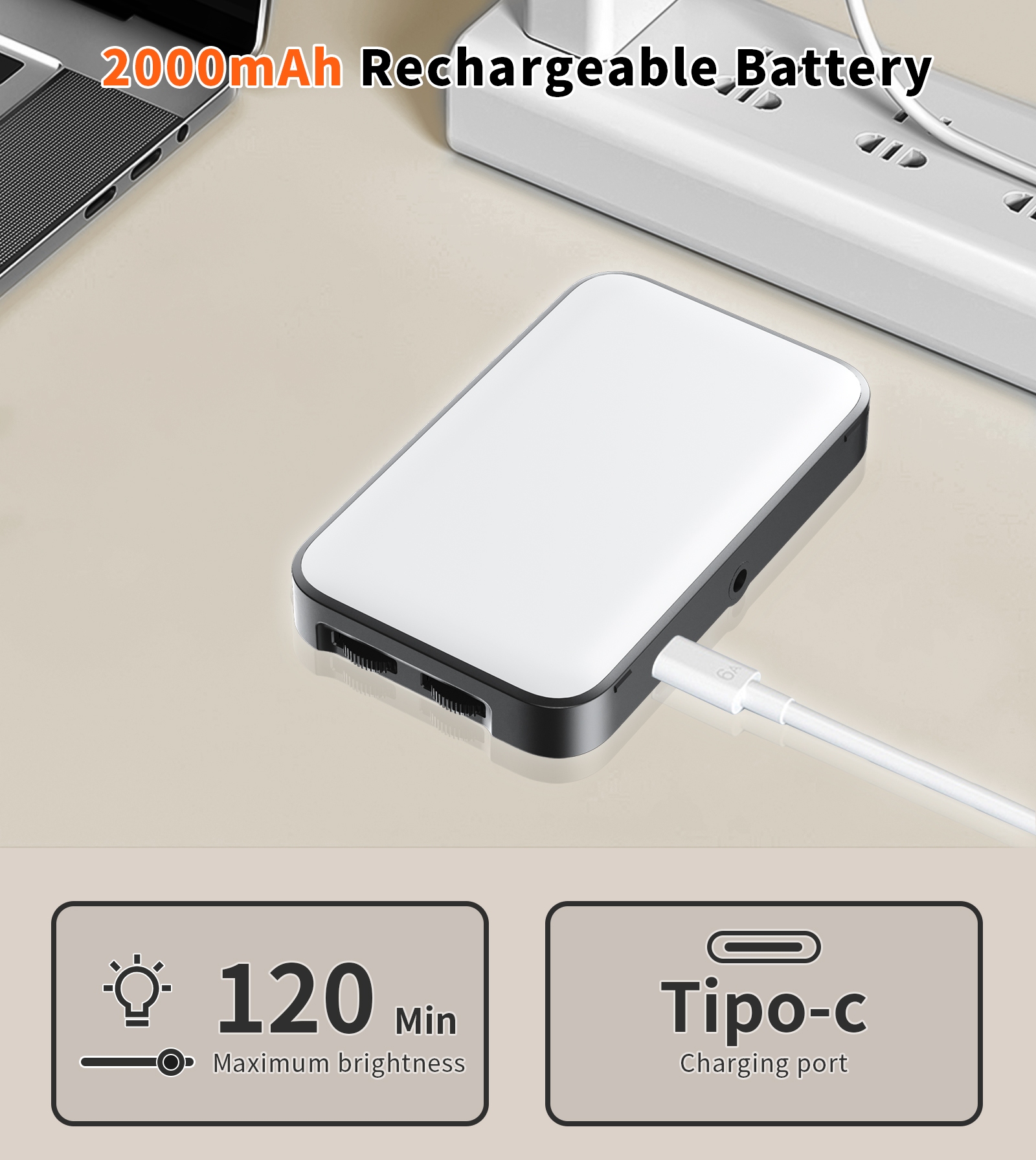 Rechargeable Battery: The LED cell phone light has a built-in 2000mAh battery and can be used for up to 120 minutes. It comes with a charging cable for added charging convenience.
