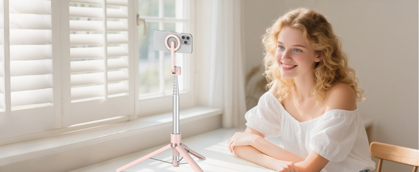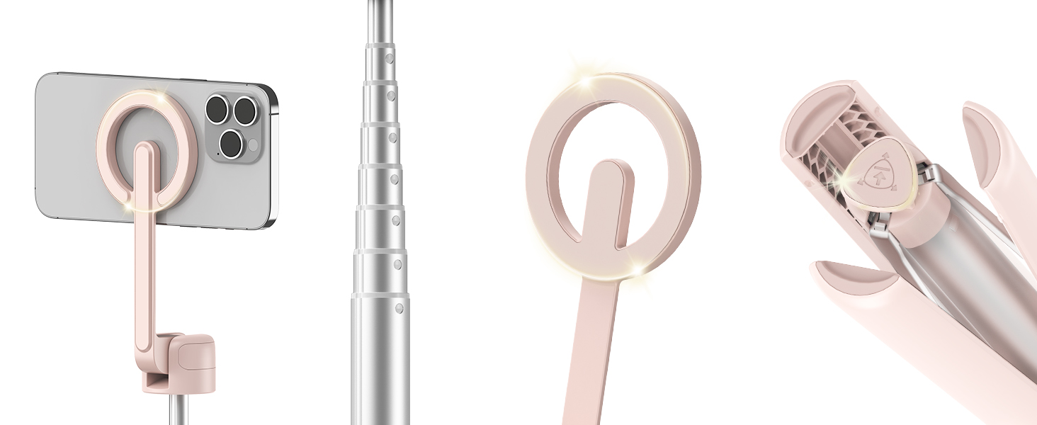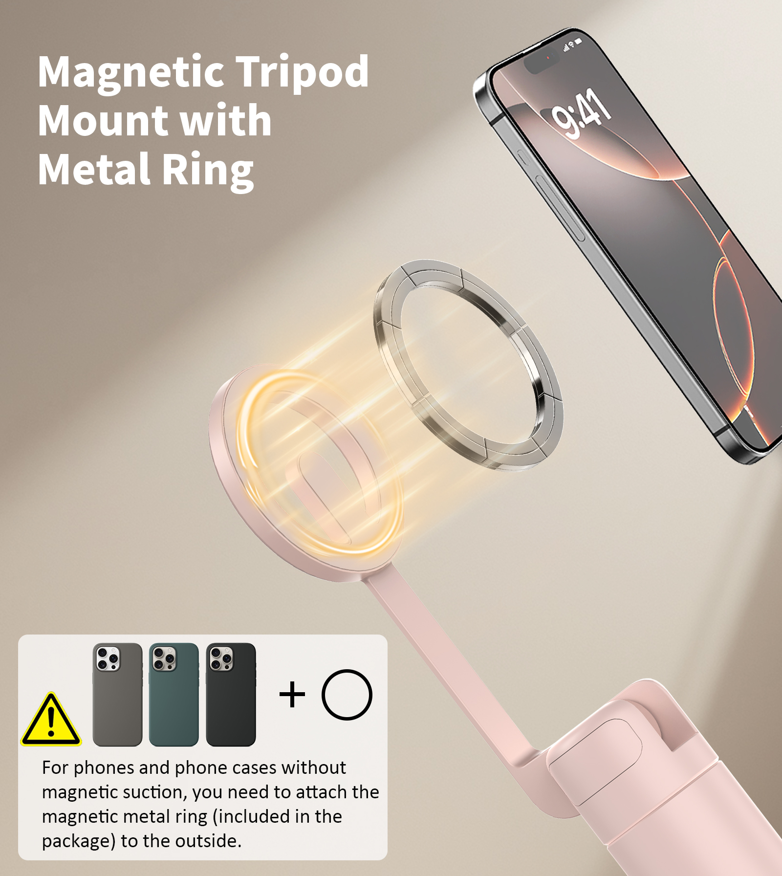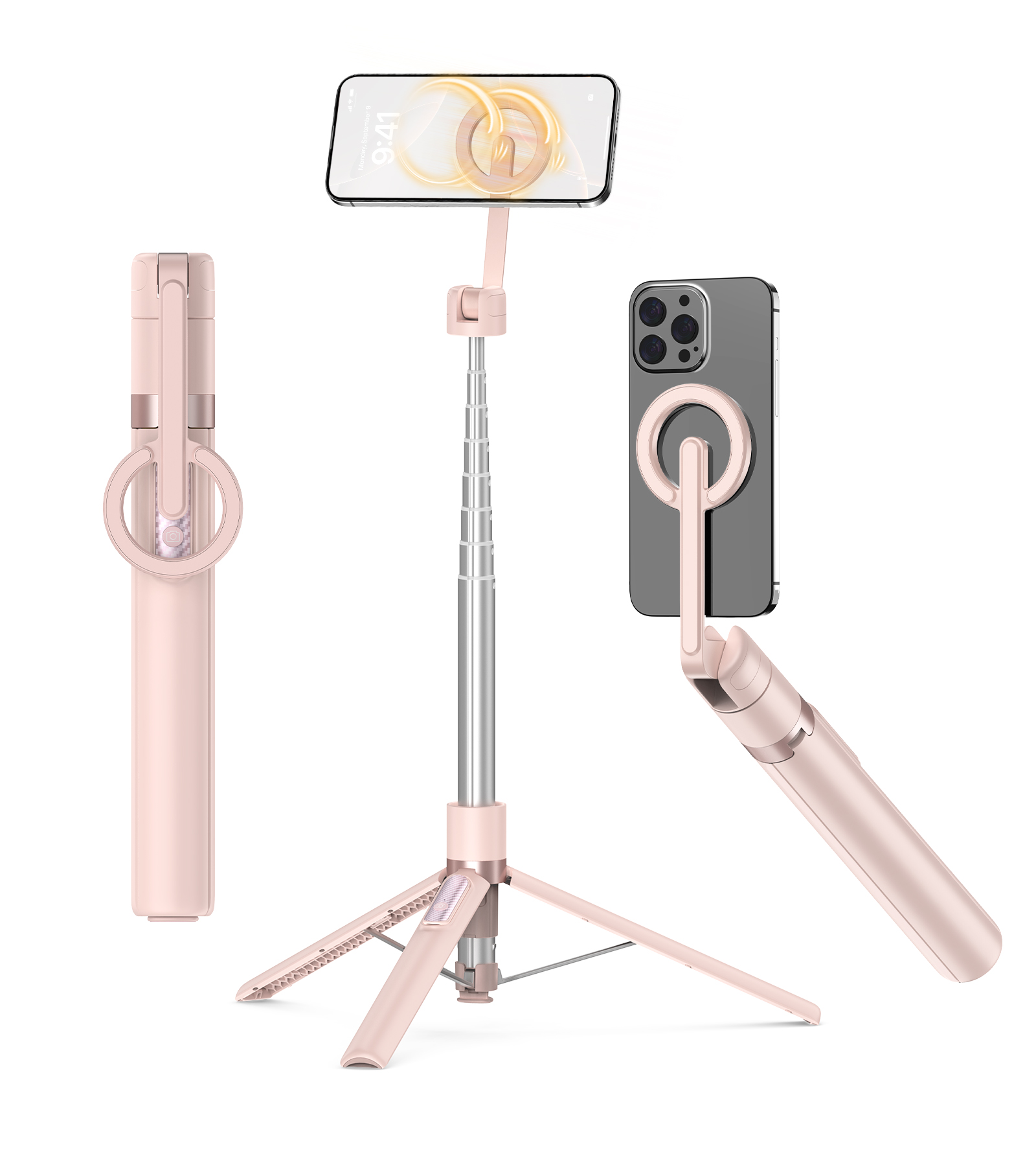 TONEOF 68" Magnetic Selfie Stick Tripod with Aluminum Strong Magnetic Holder for Magsafe, 360° Rotatable Travel Phone Tripod Stand with Metal Ring & Rechargeable Remote for iPhone/Android(Pink)