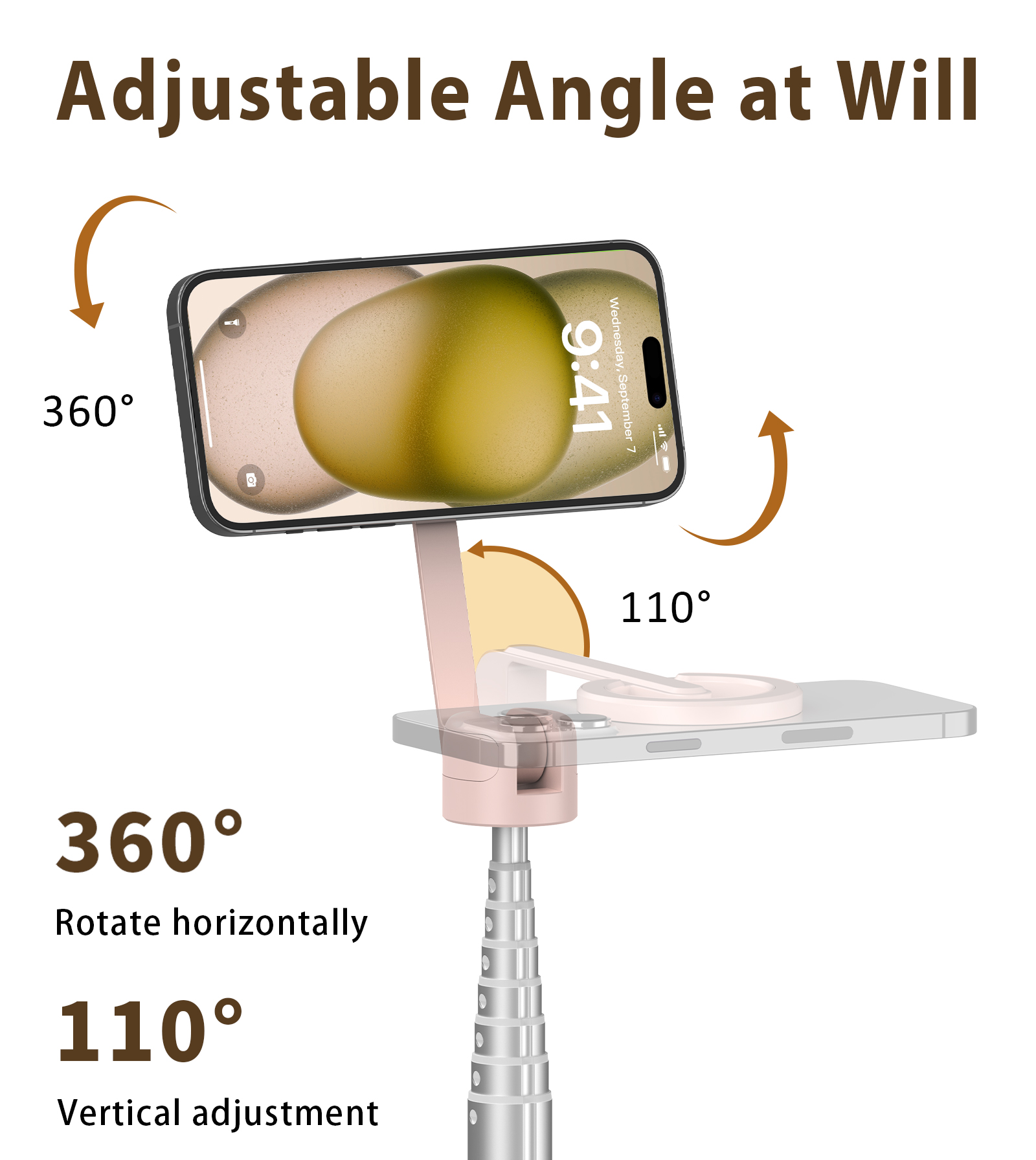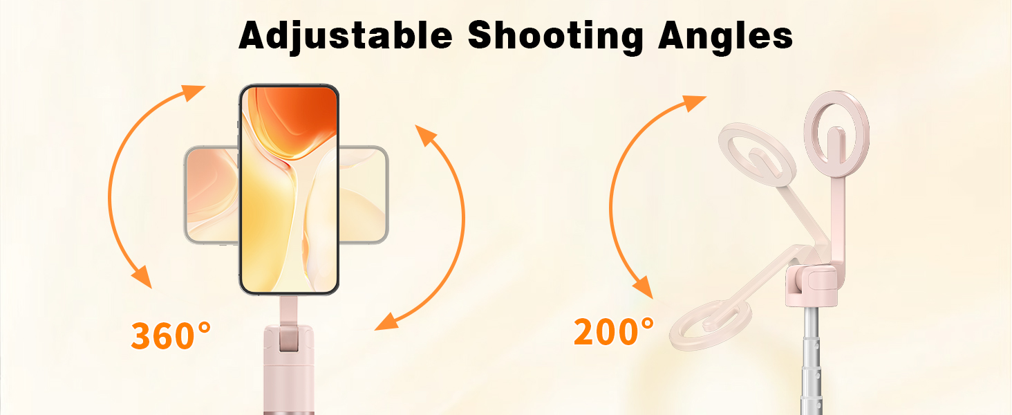 Adjustable 360° Free Rotation:The phone mount allows for 360° horizontal rotation and 200° vertical tilt adjustment, giving you complete control over your phone's positioning. This flexibility ensures you can capture photos and videos from different angle, whether you're shooting landscapes, portraits, or dynamic action shots.
