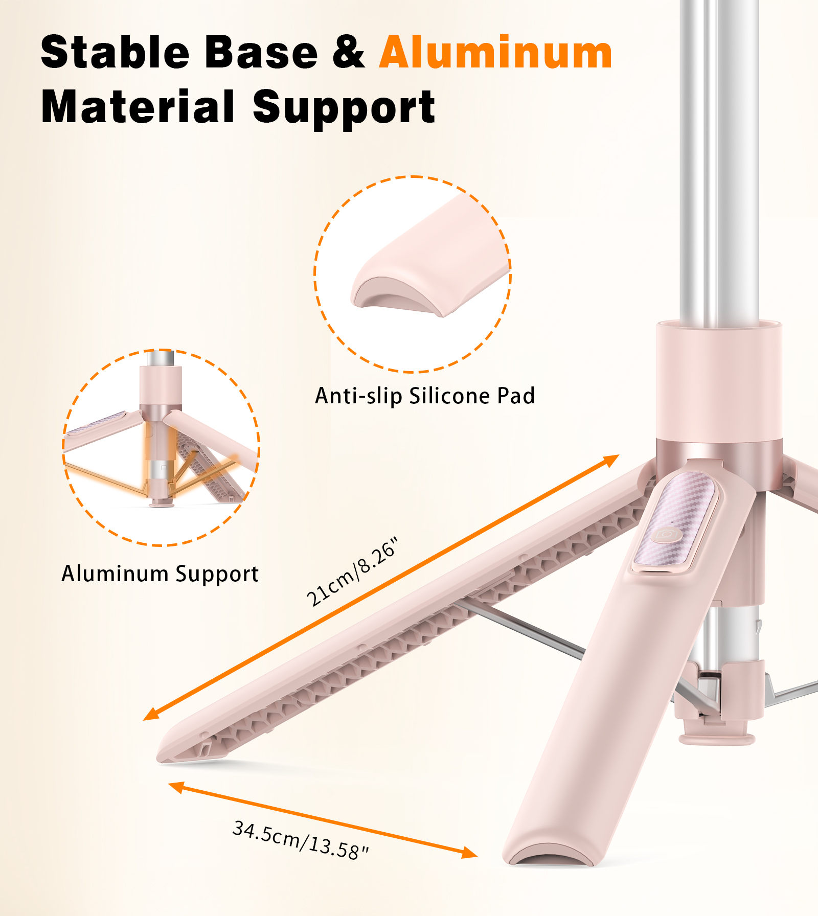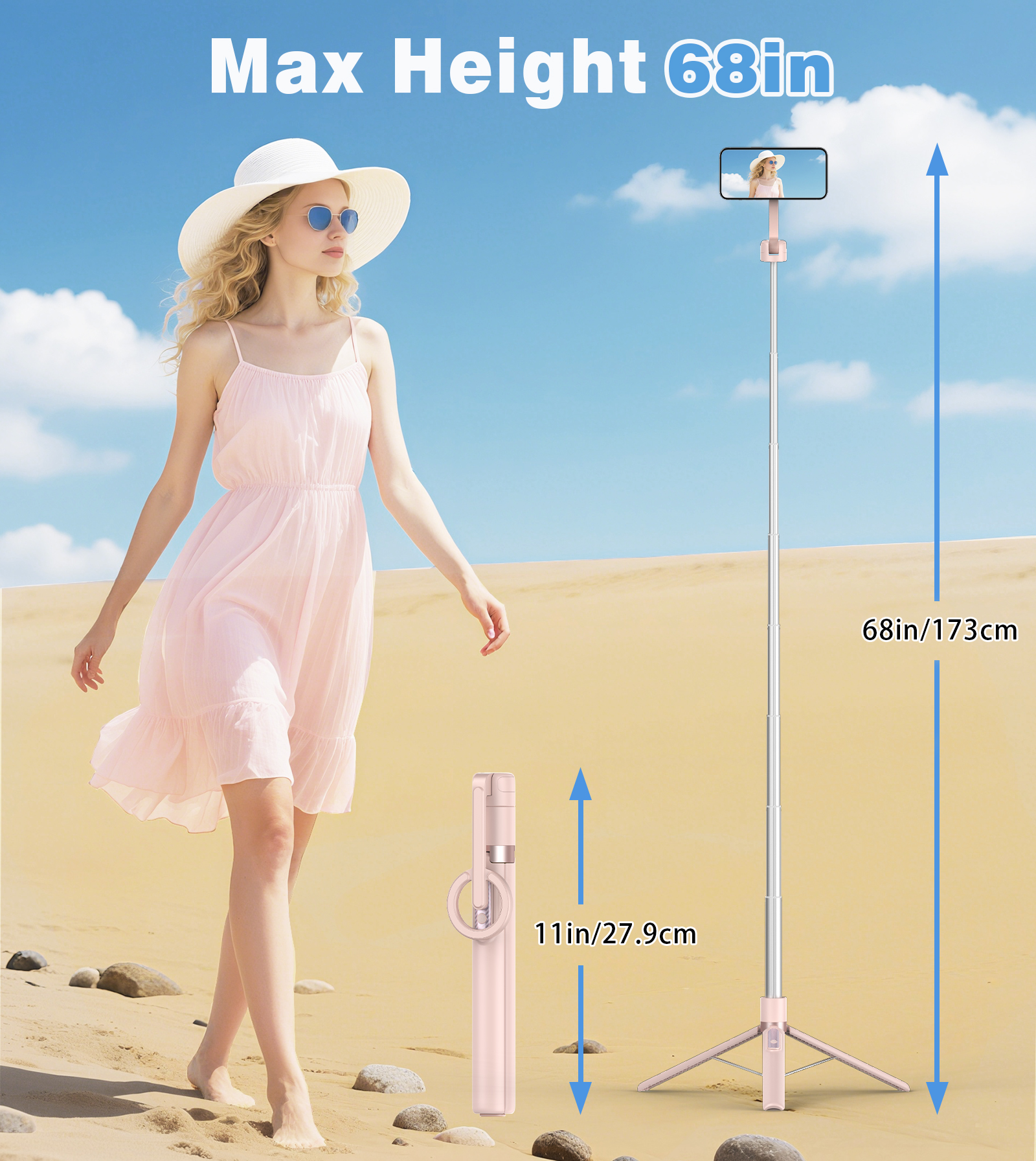 Max Height 68in:Featuring 8-section aluminum alloy telescopic rods, this tripod for iphone extends from 11 inches to 68 inches (173 cm), offering stability and versatility for various shooting scenarios. Whether you're capturing group photos, vlogging, or recording videos, the adjustable height ensures you get the perfect frame every time.