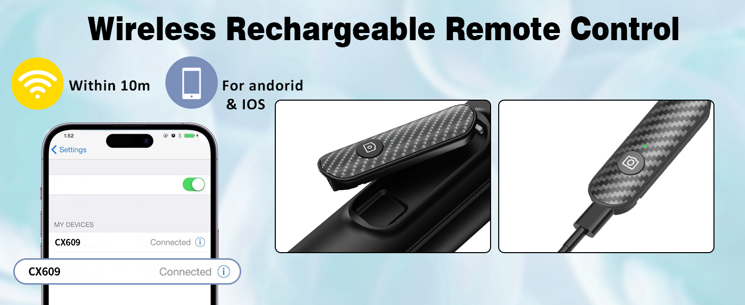 Built-in Rechargeable Remote:The selfie stick for iphone comes with a built-in, detachable wireless remote control that supports charging. This remote allows you to take photos or start/stop video recording from a distance, making it ideal for solo travelers, content creators, or anyone who needs hands-free operation.