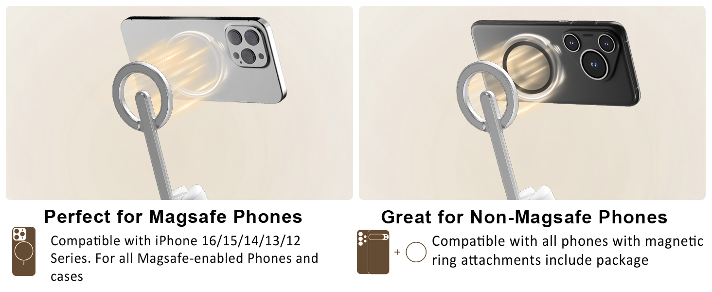 Wide Compatibility & Metal Ring:The cell phone stand for magsafe is compatible with iPhone 12/13/14/15/16 series and more (all phones that support magnetic). For non-magnetic devices, the included metal ring can be attached to your phone, enabling it to work seamlessly with the magnetic mount. This ensures wide compatibility with a variety of smartphones, making it a versatile tool for all users.
