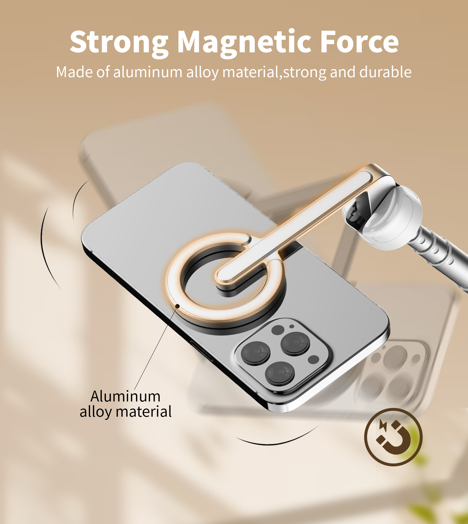 Magnetic Aluminum Phone Mount:The phone stand is made of aluminum,compatible with magsafe function, allowing seamless attachment for MagSafe-enabled devices.During use, you can quickly attach and detach the cellphone, which is more convenient and sturdier than the ordinary spring-loaded phone clips.The cell phone holder uses a powerful magnet to provide a stable and secure hold for your phone.